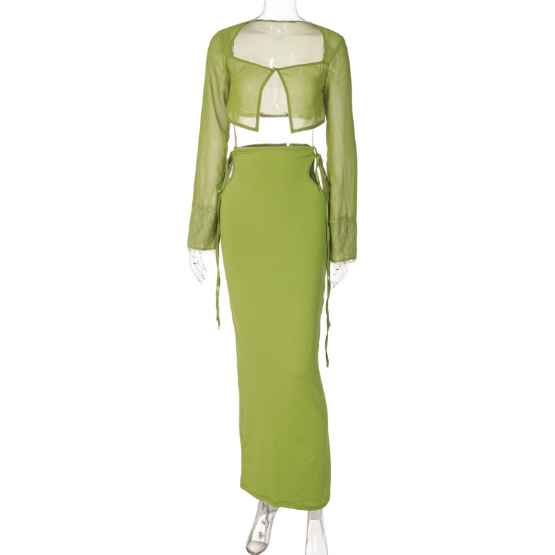 2021 Winter Hot New Long Sleeve T-Shirt Cardigan Hollow Out Tie Half-Length Skirt Set Export Women's Fashion